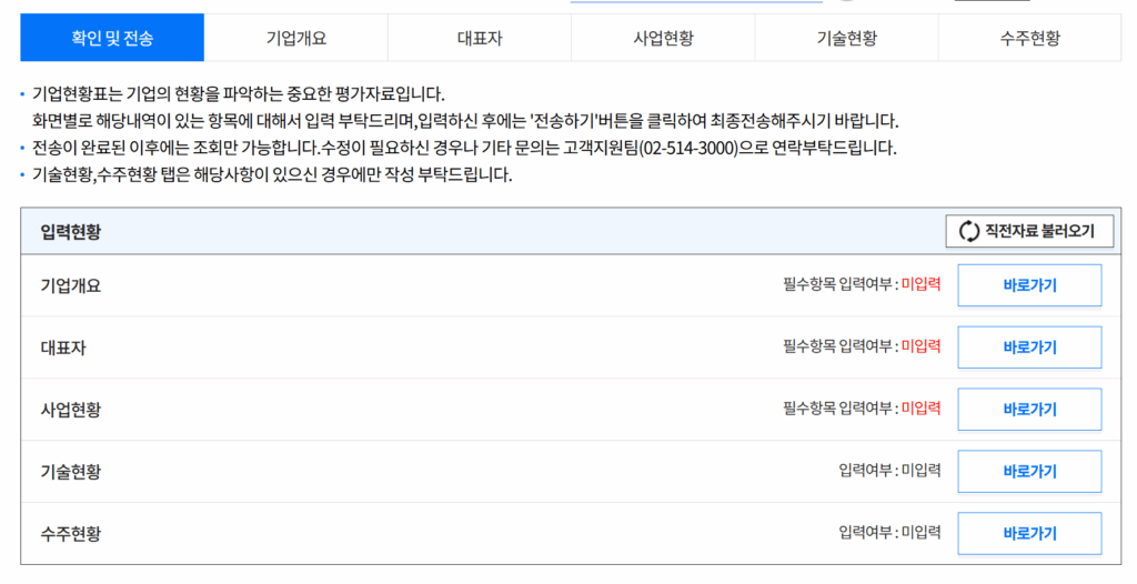 재 평가 업체 분들은 우측에 직전자료 불러오기 라는 버튼을 클릭 하시고 별 다른 내용 기재하실 필요 없이 변경된 내용만 수정해 주시면 됩니다.